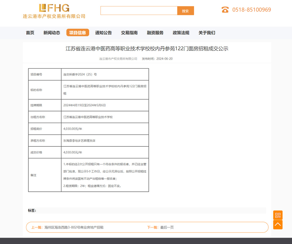 江苏省连云港中医药高等职业技术学校校内丹参苑122门面房招租成交公示