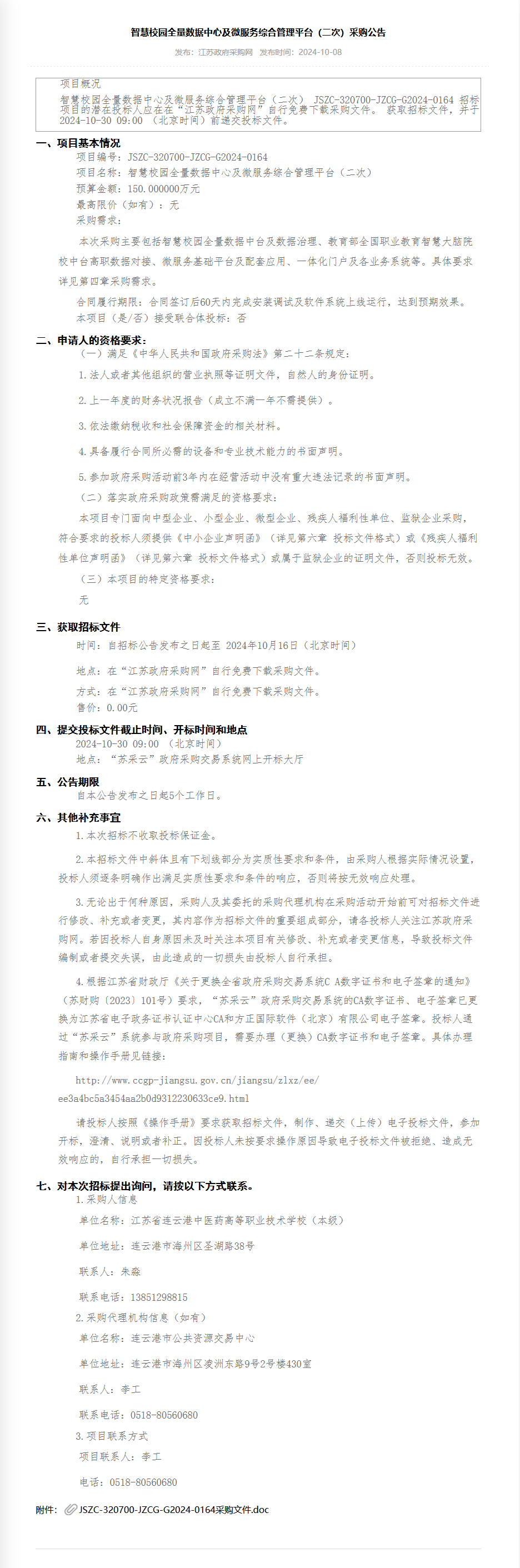 智慧校园全量数据中心及微服务综合管理平台(二次)采购公告