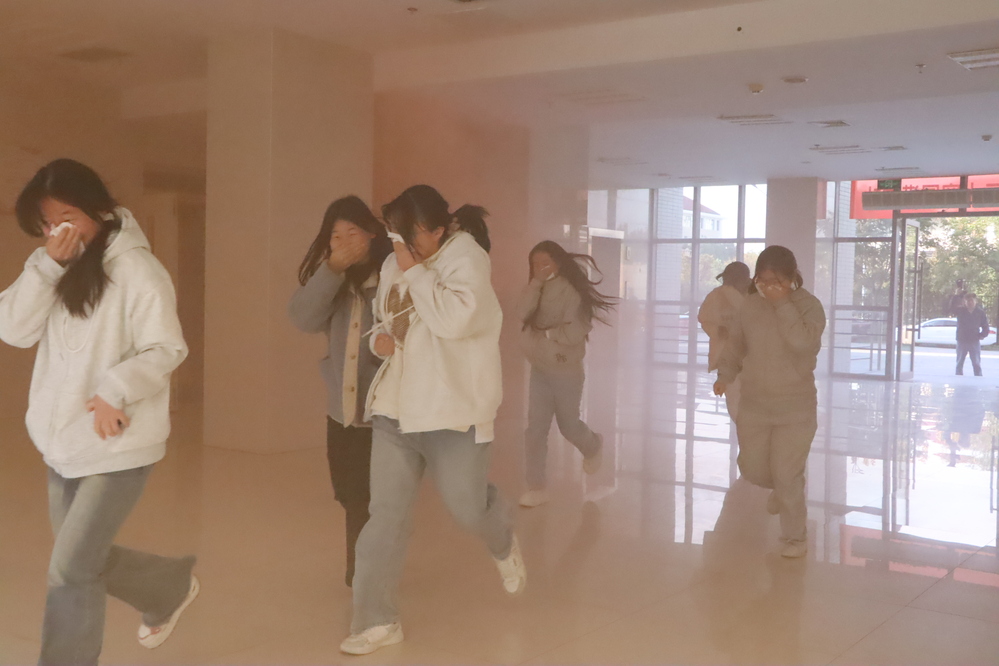 随着模拟烟雾在百合楼内升起,警报声骤然拉响,演练正式启动。总指挥胡玉涛在接到火情报告后,立即下达疏散指令。各楼层任课教师迅速反应,按照预定方案,组织学生用湿毛巾捂住口鼻,低姿弯腰,沿指定疏散路线快速撤离。疏散组、保障组等成员各司其职,引导人流、维持秩序、检查滞留人员,整个过程紧张而不慌乱,有序且高效。