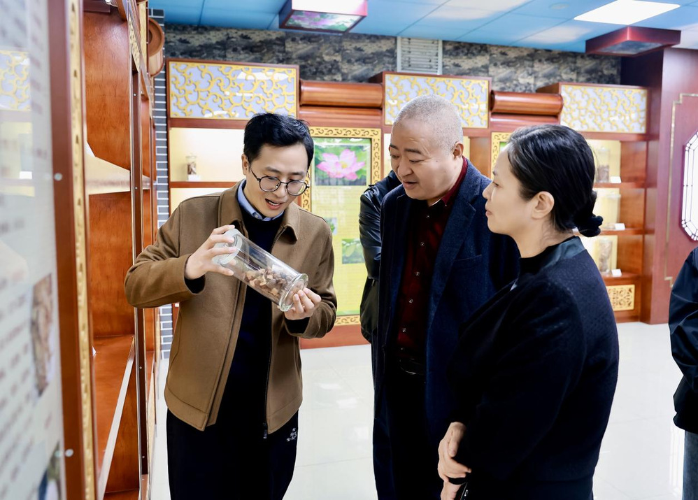 在张卫平的细致讲解下,考察团先后参观了中药资源区、原药材区、中药真伪区等核心展区,近距离观赏了11000 余件中药标本、饮片及原植物藏品,深入了解了古城海州本草发展历史、中医药非遗文化传承脉络,以及博物馆在老药工传承体系建设、专业人才培养等方面的显著成效。
