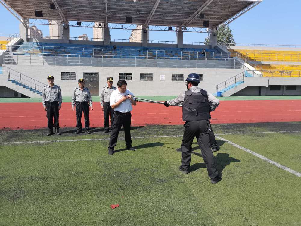 本次培训演练,首先对保安队伍进行了防暴警具的使用方法和协同配合的技能培训,还模拟不法分子冲击校园威胁师生人身安全的场景,由工作人员扮演的“歹徒”手持凶器威胁学生安全,门卫按下一键报警装置后,同时启动安全应急预案,保安人员使用防暴盾牌和防暴腰叉等器械与“歹徒”进行搏斗,将“歹徒”控制或制服。