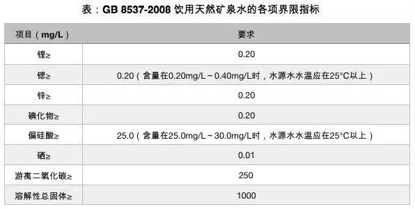 首先,要知道我国对于什么样的水能称得上「饮用天然矿泉水」是有明确要求的。《GB 8537-2008 饮用天然矿泉水》规定,要命名为「饮用天然矿泉水」下表中的八项指标得至少有一项(或一项以上)符合要求。