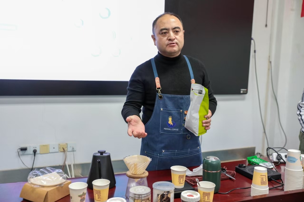 活动现场,浪漫而浓郁的咖啡香气与清新的本草气息相互交融。胡主席以咖啡为媒,传国粹之美,向海洋大学教职工们详细介绍了本草咖啡的历史渊源、制作工艺、口感特点及所选药材的养生功效,还深入浅出地讲解了中医养生知识,引导教职工将养生理念融入日常工作生活。在本草咖啡制作体验区,还指导教职工们亲手制作了属于自己的本草咖啡。