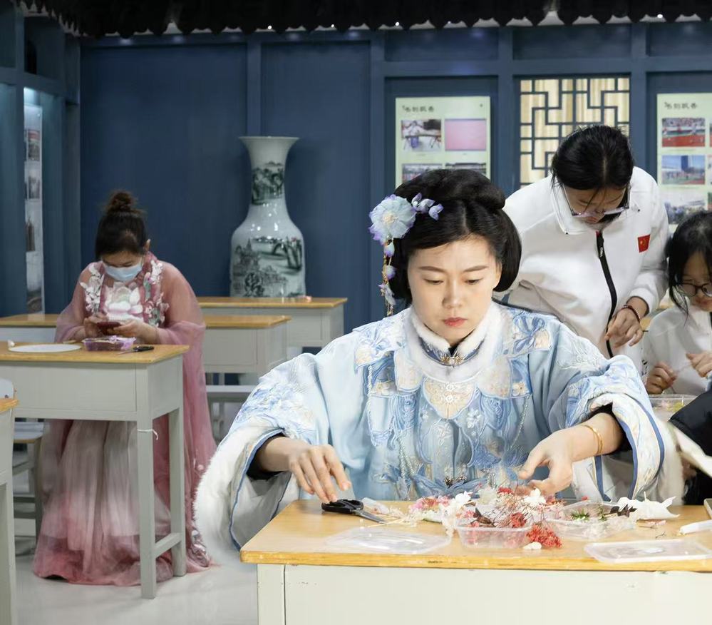 随后,为了博得美人一笑,摄影师跟随着佳人们灵动的步伐,精心捕捉着每一个精彩的瞬间,有的在专心致志地制作着美妙绝伦的花瓣团扇,有的在出神入化地临基着豪放婉约的唐诗宋词,有的轻倚古风格窗,有的穿越长廊木桥,有的驻足花间陌道……浓浓的时代感为青春的校园上演了一场华丽的汉服秀。