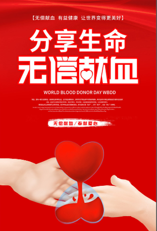 无偿献血是一项利国利民的公益性事业,是一项关系社会和谐稳定、家庭幸福安康的民生工程,更是一座城市文明进步的标志。献血救人,血液可以再生,生命不可重来,为了你,为了我,为了他,为了我们大家的生命保障,我们在此倡议,请大家勇敢的伸出自己爱的臂膀,用真情的阳光让一朵朵需要救助的生命之花重新绽放。