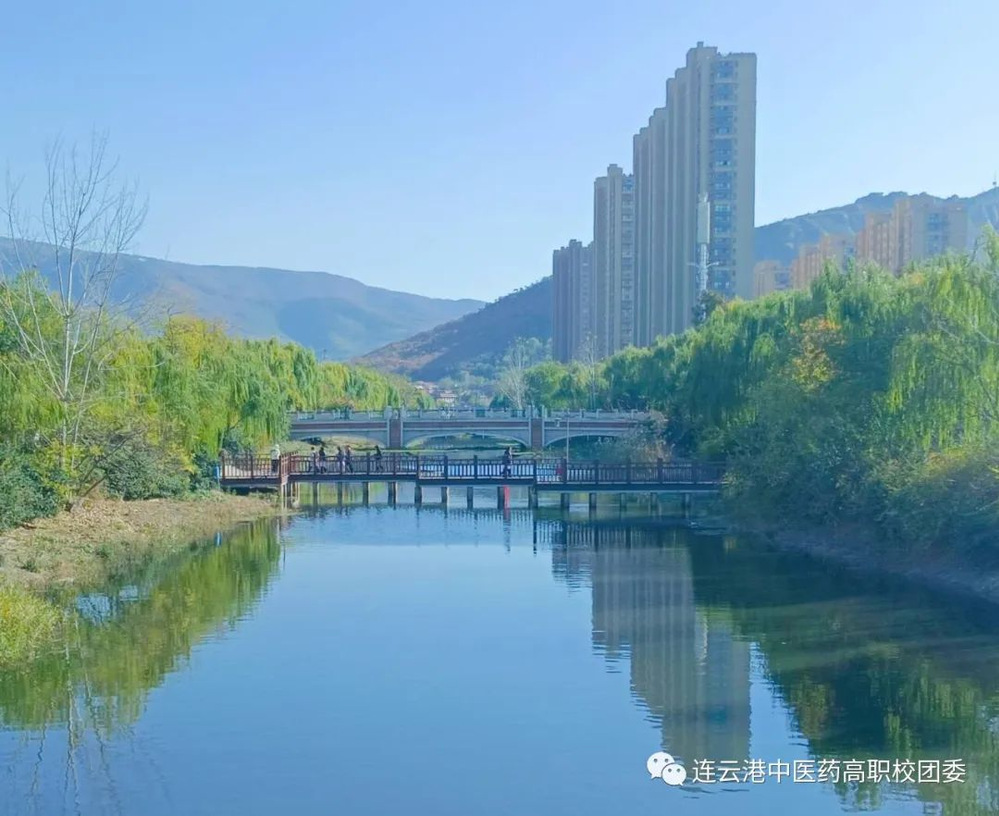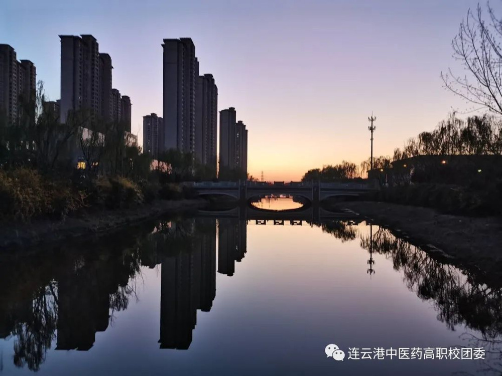 河水倒映出大楼和小桥,这一刻仿佛天与水连接在了一起。