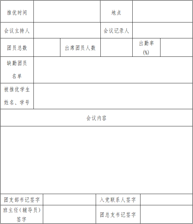 序号 | 姓名 | 学号 | 性别 | 团支部名称 | 现任职务 | 成绩排名 (排名/总人数) | 入团 时间 | 申请入党时间 | 推优率 赞成数/投票人数 | 是否录入 “智慧团建”系统 | 团支部推荐时间 | 团总支审核时间 | 党支部审批时间 |