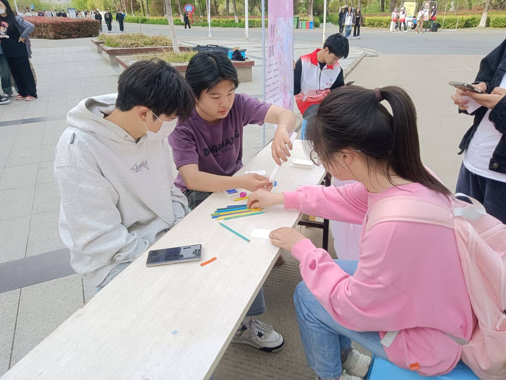 活动现场,桌子上摆放着五彩斑斓的扭扭棒,同学们纷纷动手,将一根根扭扭棒巧妙地扭成樱花状。我们还设置了丰富多彩的互动环节。同学们可以亲手制作樱花卡片、参与知识竞答,在轻松愉快的氛围中增长知识,还有“倒着说”、“孔雀东南飞”等趣味游戏。我们还准备了有趣的打气球活动和社团歌舞巡演,让大家在轻松愉快的氛围中释放压力。