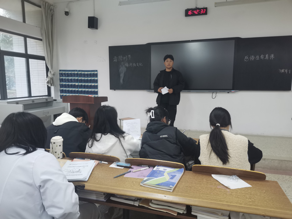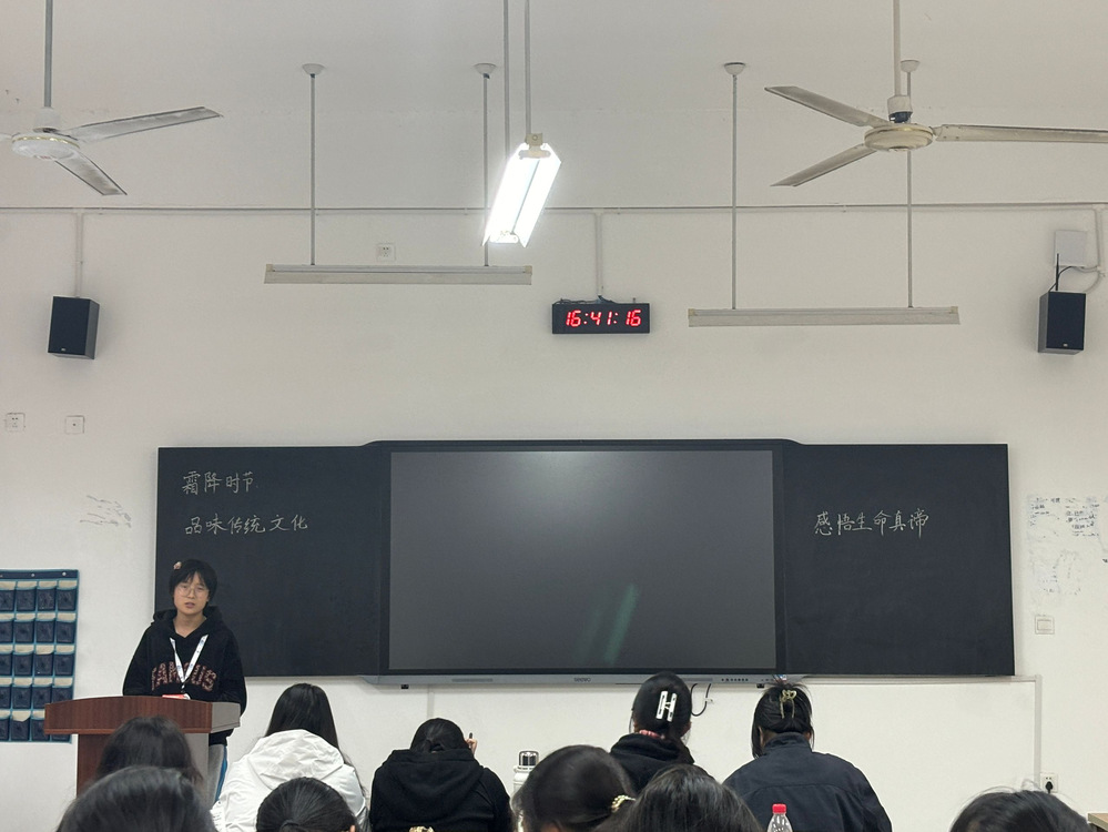 霜降作为中国二十四节气之一,标志着秋季的结束和冬季的开始,为了弘扬和传承霜降这一传统节气的文化内涵和自然智慧,增强学生对传统文化的认同感与归属感,2024年10月22日至24日,我校在益智楼B101举办了“霜降时节:品味传统文化,感悟生命真谛”为主题的演讲比赛。