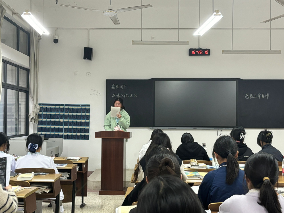 活动现场,来自不同班级的参赛者齐聚一堂。参赛者们围绕霜降时节的文化内涵、气候变化特点、相关传统习俗等多方面展开精彩演讲,王雨露同学深情讲述了古人对这一节气的独特感悟,譬如宋代诗人苏轼的“霜降水痕收,浅碧鳞鳞露远洲。”;胡亚文同学则详细介绍了霜降前后农事活动的注意事项,此时大部分农作物已成熟,要抓紧完成秋收工作,像玉米、高粱等要及时收割,避免因霜冻等天气造成损失,确保颗粒归仓,一般来说,玉米需在霜降前收割完毕,否则可能影响产量和品质。这让大家对农业生产与节气的紧密联系有了更深入认识;张慧同学演讲了霜降果韵——柿子,以味觉探索季节的诗意,在这霜降时节,柿子它不仅给我们带来了味觉上的享受,更承载着丰富的文化内涵和美好的寓意。
