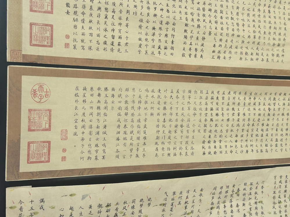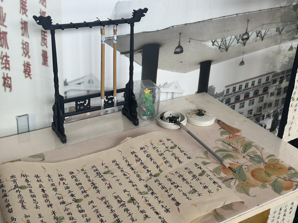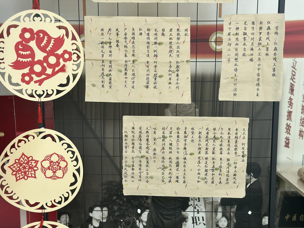 展览现场,一幅幅书法作品错落有致地陈列,墨香四溢,并且搭配了学生优秀的剪纸作品。同学们在作品前驻足凝视,低声交流,不时发出赞叹之声。有的同学互相探讨书法的内容,有的则用手机拍照记录下这些精彩瞬间。