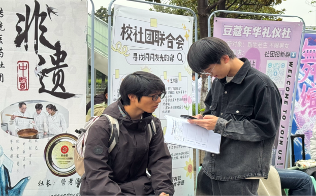 招新现场,校学生会热情地向新生介绍部门职能与特色活动,新生们踊跃咨询、积极报名,展现出对参与校园管理与服务工作的高度热情。例如耳穴社以“探索耳穴奥秘”为主题,推广中医耳穴疗法,帮助学生掌握实用健康技能;推理社以“真相之约”号召推理爱好者,通过破解谜题、挖掘线索,培养逻辑思维能力,为爱好者搭建交流平台;兔子先生吉他社以现场吉他演奏展现音乐风采,为吉他爱好者提供学习、表演机会,丰富校园艺术氛围。众多社团各展风采,为校园生活添彩赋能。除了各社团的精彩亮相,校学生会也在校园生活中扮演着关键角色:秘书处统筹部门协作,国旗部主导护卫队训练与管理,新媒体传递校园动态;社团联合会教学部规范社团开课,艺术团营造艺术氛围,广播台传递校园声音,活动部赋能兴趣绽放;青协人力资源部凝聚志愿力量,社会实践部搭建社会桥梁,资产管理部保障物资运转,红十字会传播生命关怀;校团委组织部强化团务建设,宣传部弘扬校园正气,推优部助力政治成长,权益财务部维护学生权益。
