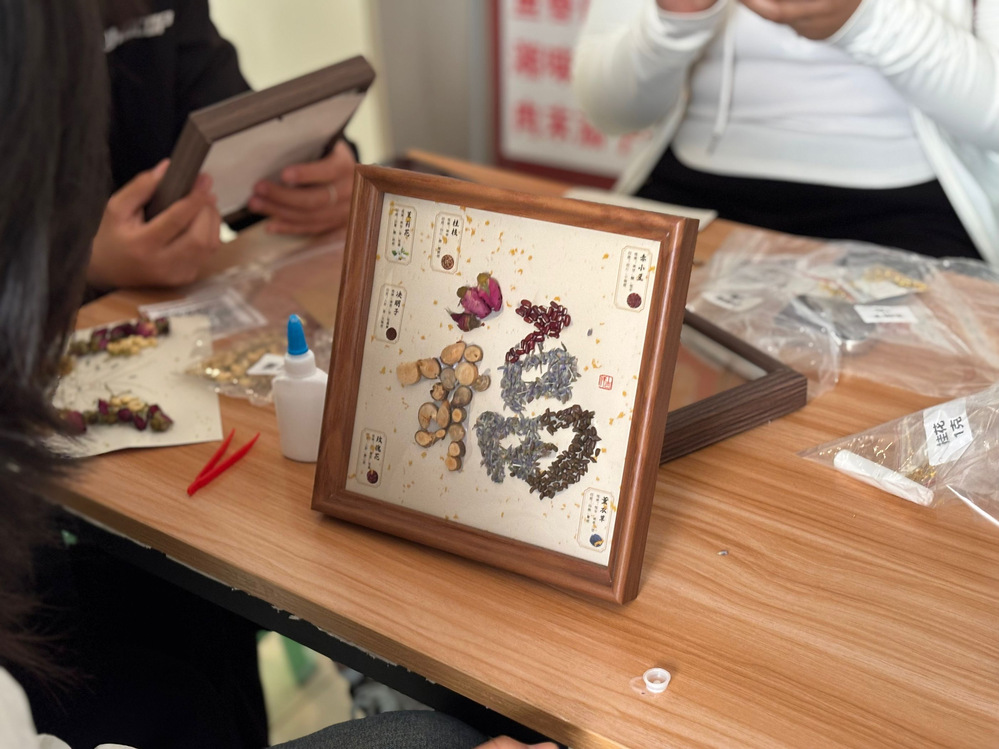 学生们在中医药社团成员的指导下开启创作。五颜六色的药材琳琅满目,既有常见的枸杞、菊花、艾叶,也有形态别致的灵芝片、木蝴蝶,散发出阵阵草木清香。