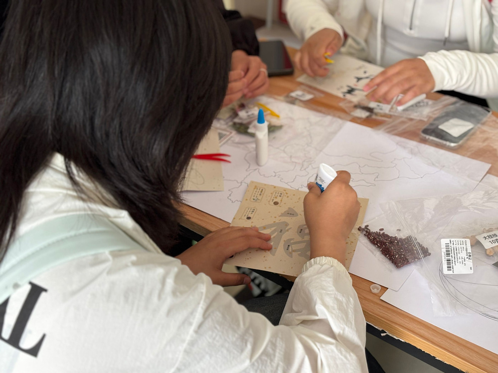 制作过程中,各组学生分工协作,有的精心设计画稿,将药材按色泽与形状分类;有的细心裁剪粘贴,用镊子将药材拼成花鸟、山水等图案。现场笑语不断,一位学生说道:“原来中药不仅能治病,还能作画!”经过两小时的巧手雕琢,一幅幅独具匠心的贴画逐渐成型:金黄的银杏叶化作蝴蝶翅膀,深褐的决明子拼出远山轮廓,朱红的洛神花点缀成春日繁花……