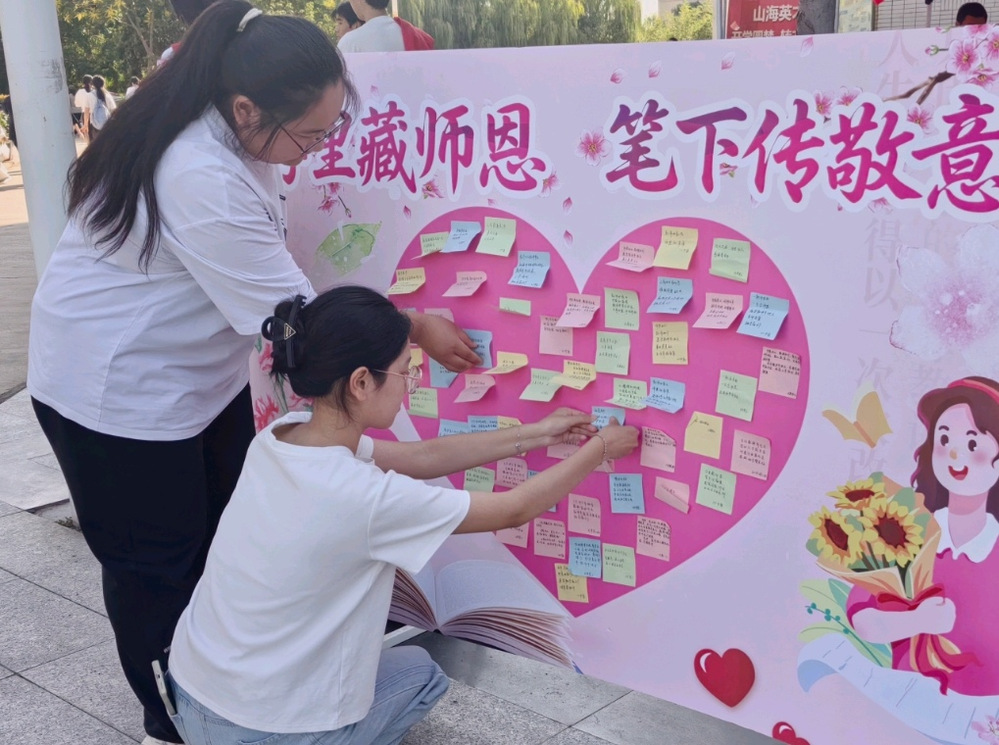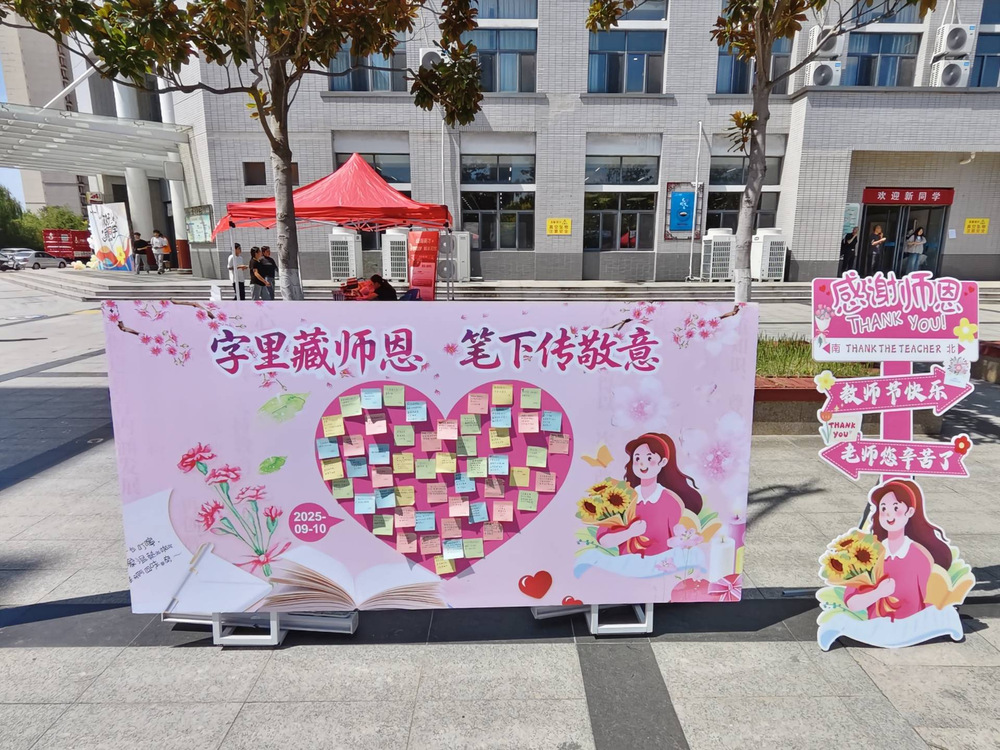 在成长历程中,教师的爱常蕴含于谆谆教诲与默默付出中。2025年9月10日,为弘扬尊师重教的传统美德,加深师生之间的情感联结,学校在茯苓园门口举办了“字里藏师恩,笔下传敬意”教师节活动,引导更多人意识到教师职业的价值,传承尊师重教的传统美德。