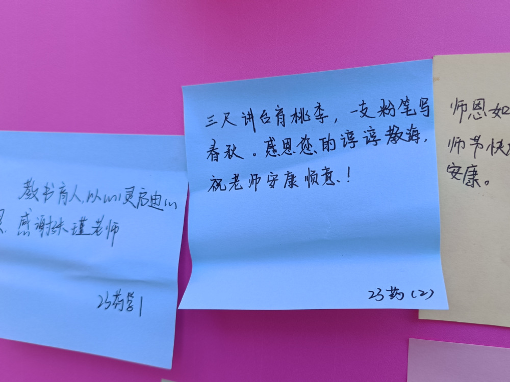 在教育教学的征程中,师生之间的情感交流是推动教育前进的润滑剂与催化剂。此次活动为学生提供了一个对老师表达感恩之情的宝贵契机,学生们通过书写心声,将平日里难以言表的感激与真挚祝福尽情倾诉,每一句话都饱含着学生对老师的深深敬意。一块精心布置、写满学生祝福与感恩的KT板,被放置在了茯苓园门口,成为一道亮丽的风景线。便利贴展示的方式让这些情感得以公开共享,形成了强烈的情感共鸣氛围,同学们也在观看过程中,再次感受到与老师之间那份深厚的情谊,这份情谊如同陈酿的美酒,历久弥香。