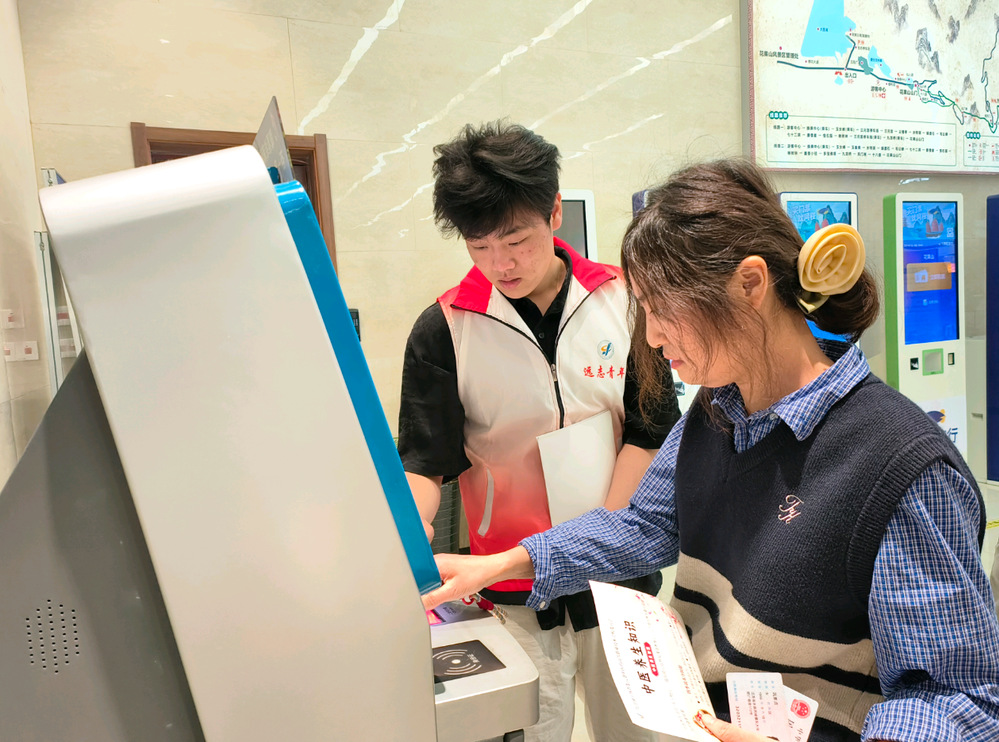 活动中,志愿者们各司其职,热情满满。在游客服务中心购票区,面对操作自动购票机面露难色的游客,志愿者们热情上前,耐心引导:“您先按出行人数选票数,填好手机号,再选支付方式付款,就能获取入园二维码啦。”经他们协助,游客顺利购票,原本紧皱的眉头也舒展开了。