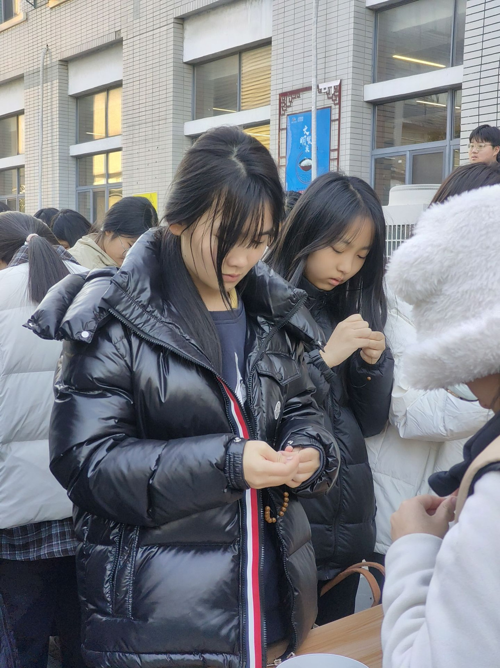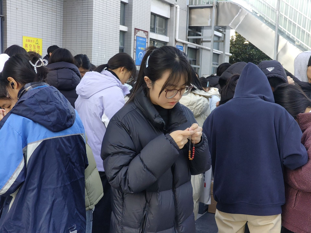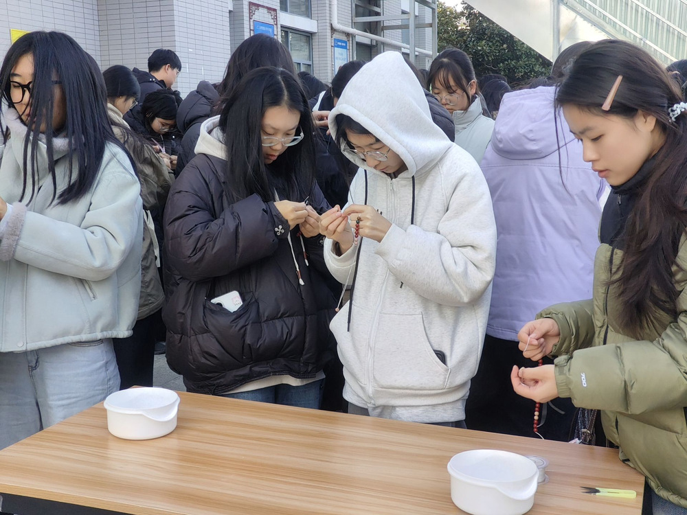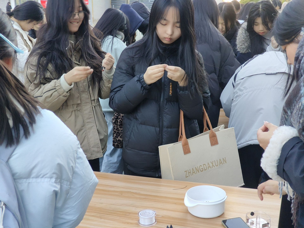 在制作过程中,同学们认真的将一颗颗饱含着传统文化韵味与匠心的香珠被穿成手串。大家相互交流、相互帮助,现场氛围温馨而热烈。