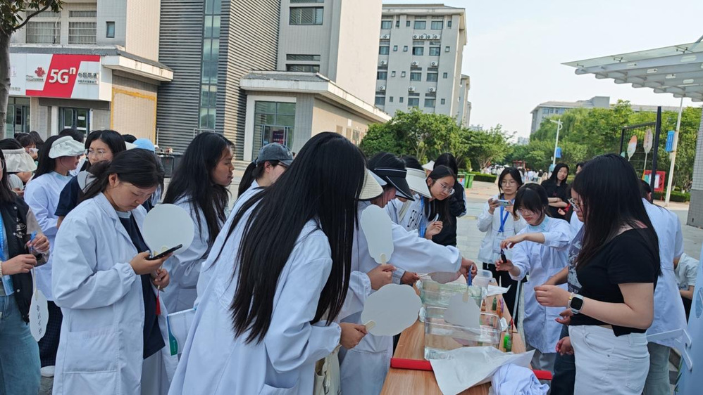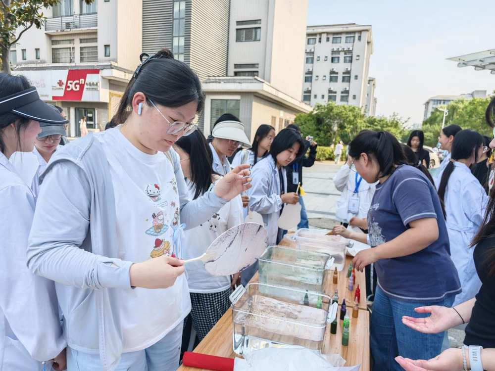 活动以中国传统漆扇艺术为载体,深度融入端午佳节的文化内涵。活动现场气氛热烈而有序,各族学子热情高涨。在工作人员的指引下,参与者们领取了空白竹扇、环保漆料及绘画工具等材料,随即投入到充满创意与想象的漆扇DIY创作中。每一次的滴漆、搅拌、入水,都仿佛是在进行一场水流的艺术表演。稍事片刻,丝丝点点的漆彩在纸扇上绽放,呈现出绚丽多彩的图案,充分展现了中华传统文化的独特魅力。不少同学还别出心裁进一步创作,根据每把扇子独特的配色,在扇面上题写诗词或书法。这些题字与漆扇的图案相互映衬,相得益彰,为整个活动增添了浓厚的艺术气息。许多少数民族同学更是在创作中融入了本民族独特的艺术风格或吉祥纹样,展现了中华文化的多元魅力与交融之美。一把把原本素朴的竹扇,在同学们的妙笔下逐渐焕发出独特的艺术光彩,成为承载端午情怀、青春创意与民族团结情谊的精美艺术品。