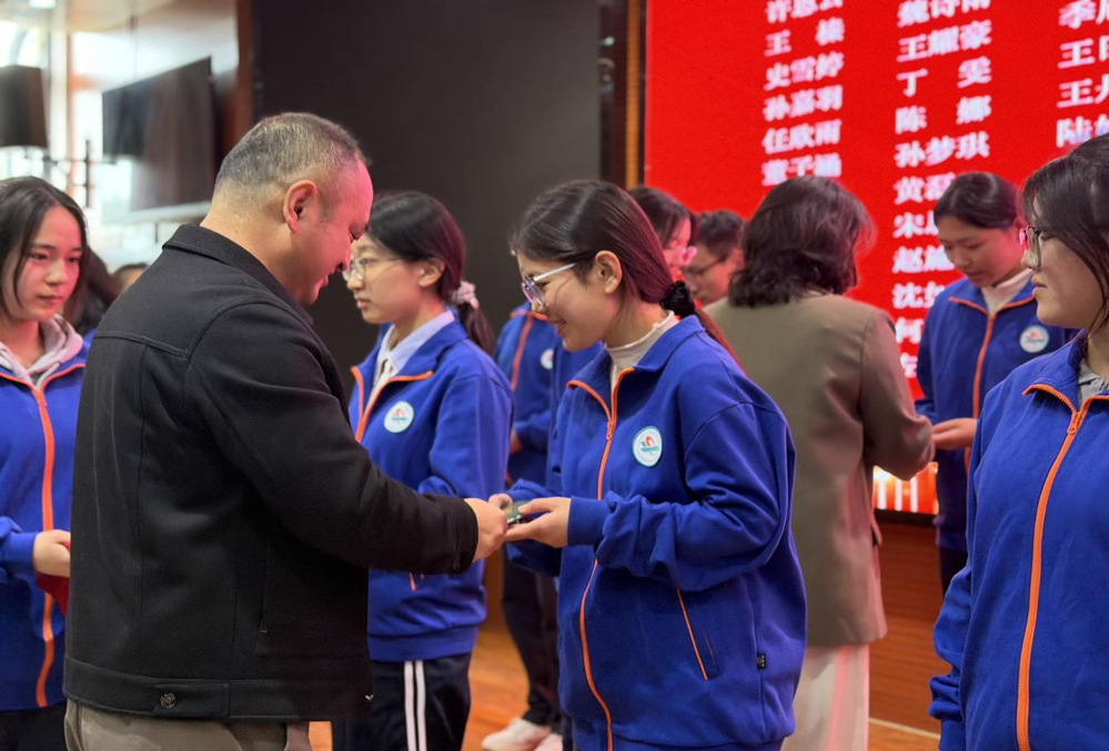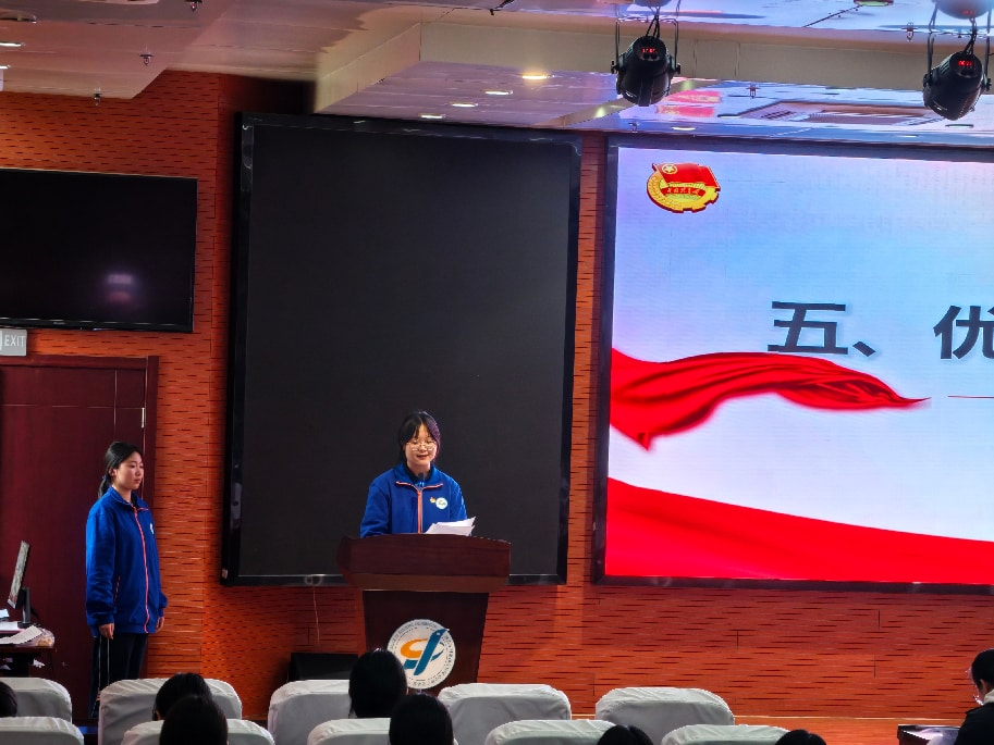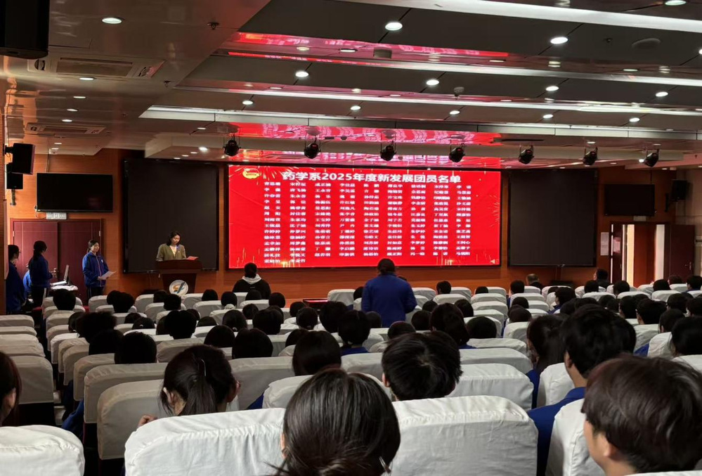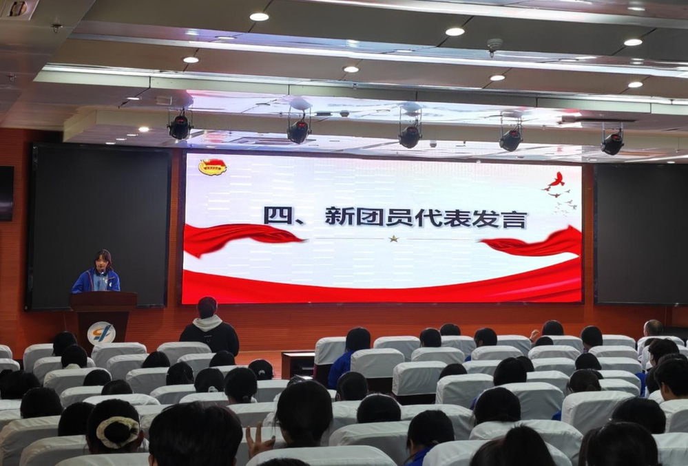 入团仪式在庄严的国歌声中拉开帷幕。主持人宣布仪式正式开始,全体人员肃立,高歌国歌,嘹亮的歌声传递着青年学子的爱国情怀与昂扬斗志。学生工作处处长胡淼宣读2025年度新团员名单,并嘱咐各位新团员在今后的学习、生活中要牢记团员义务,遵守团的纪律,在中华民族伟大复兴的时代浪潮中奋楫扬帆、勇毅前行。出席会议的各位领导和嘉宾为新团员代表逐一颁发团徽和团员证,新团员们郑重接过。团徽在胸前闪耀,标志着他们正式成为共青团,从此肩负起共青团员的责任与使命。章子萱同学带领新团员面向团旗庄严宣誓。新团员们的铿锵誓言,彰显出他们对共青团的赤诚之心,以及为共产主义事业奋斗的坚定信念。宣誓结束后,新团员代表刘籽璨同学发言,她坦言佩戴团徽、庄严宣誓让全体新团员深感责任与使命在肩,将传承共青团的优良传统,以坚定理想信念、勤奋刻苦学习、勇于担当责任、严守纪律规矩的实际行动践行团员使命,以青春之姿为共青团事业和中国梦贡献青春力量,并向在场领导、老师和同学们送上美好祝愿。优秀团员代表章子萱同学结合自身成长经历,向新团员们分享了在团组织中的宝贵经验,并号召新团员们在今后的学习与生活中勇立潮头,勤奋学习,贡献青春力量。
