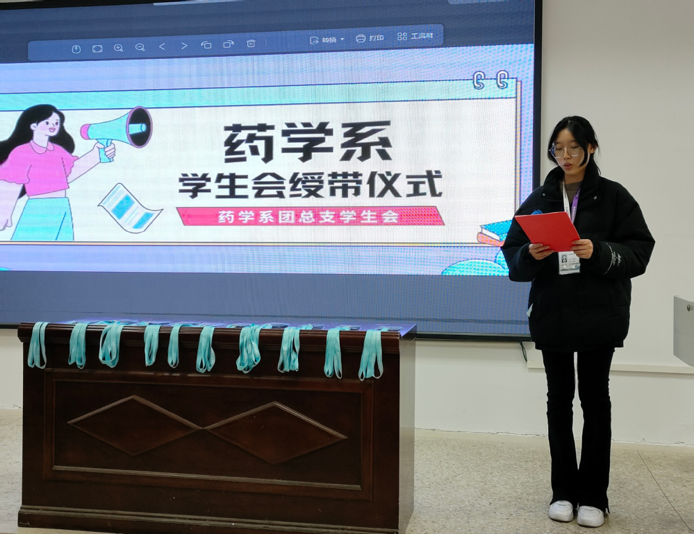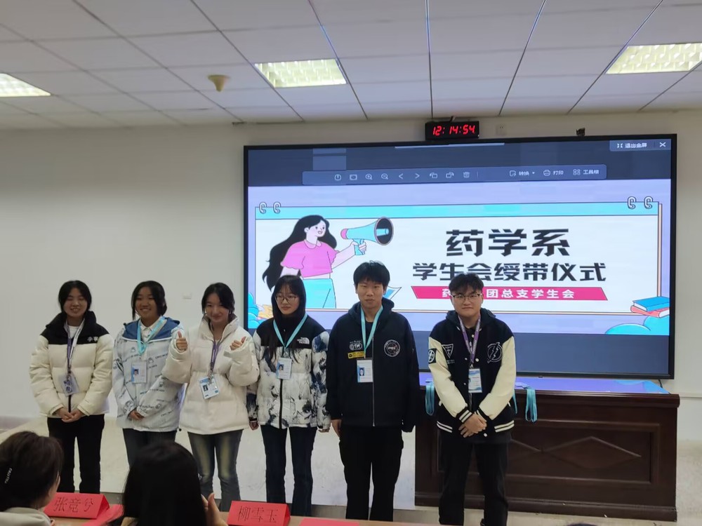 为进一步加强学生会建设,提高学生干部的积极性、主动性,充分发挥学生干部的模范带头作用,增强团队凝聚力和归属感, 2023年11月23日药学系团总支学生会在益智楼D101举行绶带仪式活动。参加本次绶带仪式的有药学系党支部书记刘钊、副书记柳雪玉、团总支书记张竞兮、各部门部长及学生会各级干部。