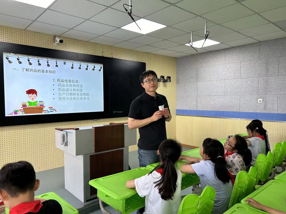 共建活动中,药学系药学专业带头人冯里老师为小学生们开设了一堂“安全用药”主题科普知识讲课,以图文并茂、生动有趣的互动竞答形式,零距离向小学生们耐心讲授常见药品药效、滥用乱吃药品的危害等健康知识,有效增强了大家用药安全意识和科学素养。讲课中孩子们兴趣高涨,一边认真倾听,一边争相举手抢答,现场气氛非常热烈。