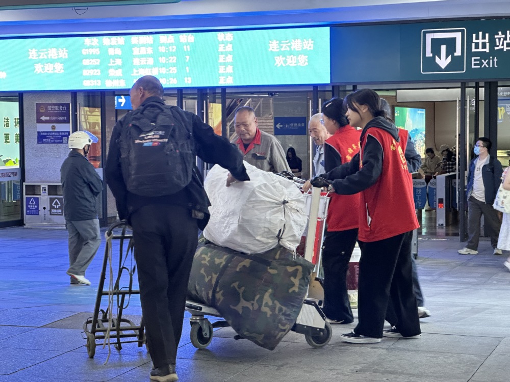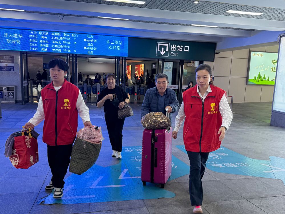 国庆期间,“雷锋车”驿站设置在高铁站出站口的正对面,是旅客出站后看见连云港的“第一道文明风景”。为了应对客流高峰,确保旅客出行便捷,国庆期间驿站全天开放,药学系近50名学生志愿者们排班每日按时到岗值守,边高举志愿服务牌,边引导指引过往旅客移步换乘。他们忙碌的身影,成为车站一道亮丽的风景线。“帮助旅客搬送行李、重物、指路、提供热水,甚至是在他们不方便时帮忙看顾一下小孩,他们每一声真诚的‘谢谢’都让我如沐春风,感受到助人为乐的快乐。”“我们做的其实都是搭把手的小事,然后每次听到旅客都能跟我们特别真诚地说声‘谢谢’,就特别满足。”学生志愿者们纷纷感慨地表示。