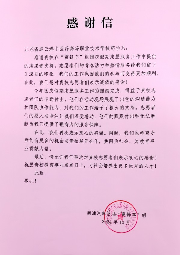 “雷锋精神,人人可学;奉献爱心,处处可为。”身处伟大的时代,我们既要学习雷锋的精神,也要学习雷锋的做法,把崇高理想信念和道德品质追求转化为具体行动,把“爱岗敬业”放在心上,把“为人民服务”融入日常,把“助人为乐”当成文明。本次‘雷锋车’志愿服务活动受到来连旅客们和“雷锋车手们”的点赞和认可,第十四届全国人大代表、新浦汽车总站第六代“雷锋车”手于丽婕专程送来感谢信,以表达对志愿者用实际行动践行雷锋精神和为民服务初心的褒扬。
