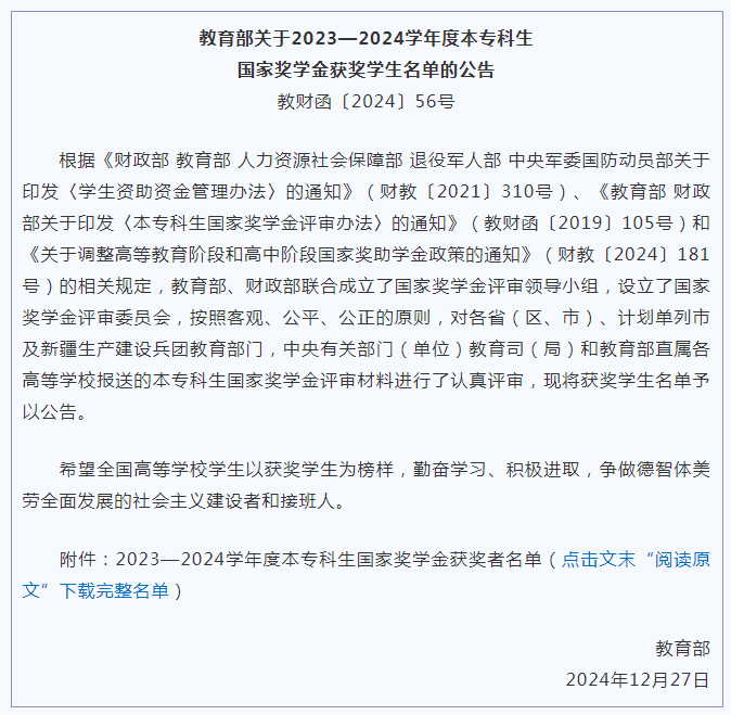 近日,教育部官网公布了2023-2024学年度本专科生国家奖学金获奖学生名单,我系2020级高职药学2班曹昕怡同学榜上有名。