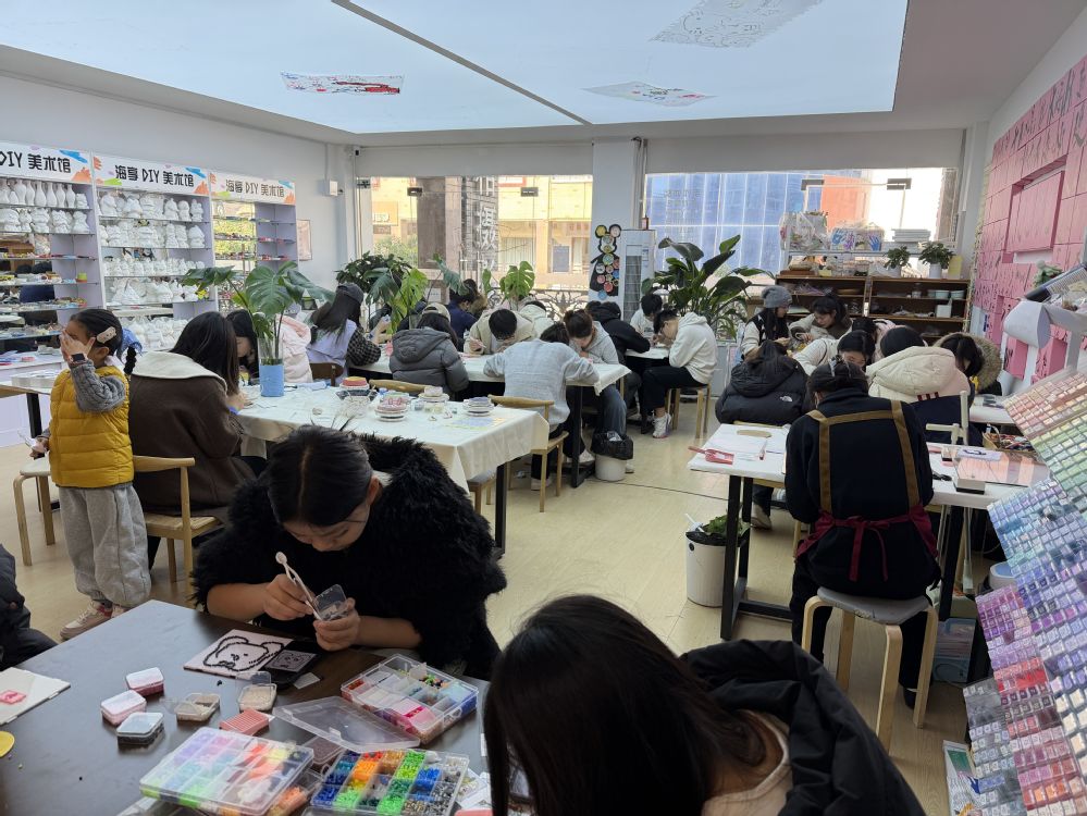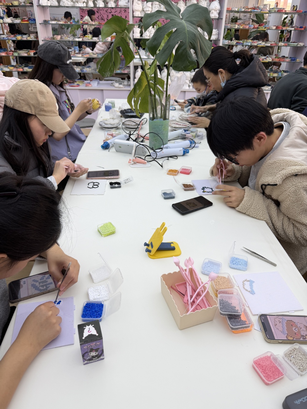 捏陶瓷区域,同学们沉浸式体验传统工艺的独特魅力。从揉泥排气、固定泥料,到转动拉坯机塑形、精修细节,每一个步骤都凝聚着专注与耐心。面对陶泥坍塌、器型歪斜等难题,大家没有轻言放弃,而是相互支招、携手调整,在一次次尝试与修正中,原本不起眼的陶泥逐渐变成圆润的杯子、可爱的小动物摆件,满满的成就感在指尖绽放。石膏娃娃上色区域则是色彩的天堂,同学们化身“创意设计师”,或精准还原经典卡通形象的原版配色,或大胆突破传统,设计出撞色鲜明、风格独特的个性造型。大家分工协作,有人勾勒轮廓、有人填充底色、有人点缀细节,在欢声笑语中,一个个朴素的白坯娃娃被赋予鲜活生命力。拼豆区域尽显细心与默契,同学们围坐在一起,共同规划图案、挑选对应颜色的拼豆,将药学元素、团结符号等融入设计,通过耐心拼接与高温定型,一个个精致的拼豆钥匙扣、迷你装饰画应运而生,每一件作品都承载着团队协作的温暖。