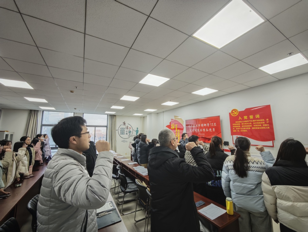 刘钊书记带领支部全体党员重温入党誓词,并对新接收的预备党员提出期望,希望牟丽娜等12名同志能够始终以共产党员标准严格自律,在工作、学习中充分发挥先锋模范作用,争取按期转正,成为一名合格的共产党员。
