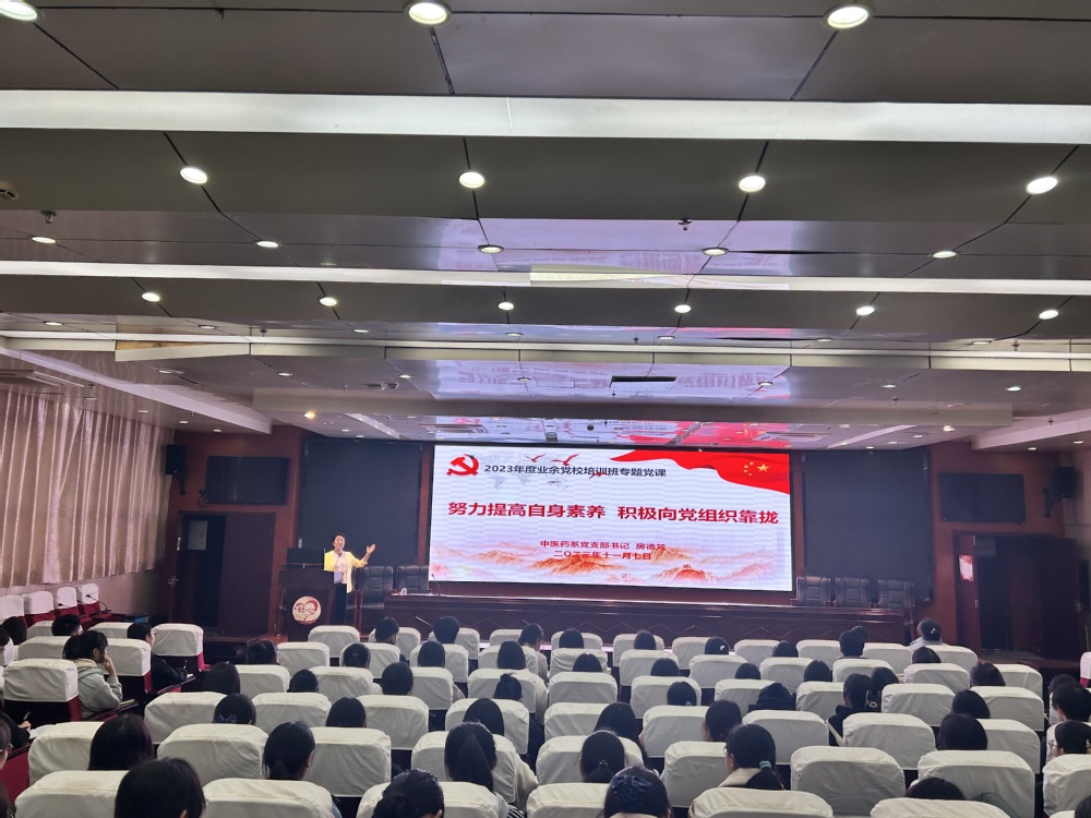 为进一步加强入党积极分子和发展对象的思想政治教育,引导广大师生更为深刻地了解党、认识党、热爱党,增强党性观念和政治素质,2023年11月7日下午,中医药系党支部书记房德芳应邀在远志楼一楼报告厅开展主题为“努力提高自身素养,积极向党组织靠拢”的专题讲座,业余党校170名师生学员参与。