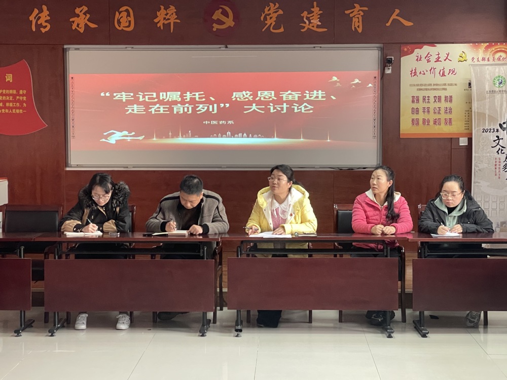 11月28日,根据主题教育工作安排,中医药系以“牢记嘱托 感恩奋进 走在前列”为主题,在远志楼博物馆党支部活动室开展大讨论。全体党员参加了会议,会议由支部书记房德芳主持。