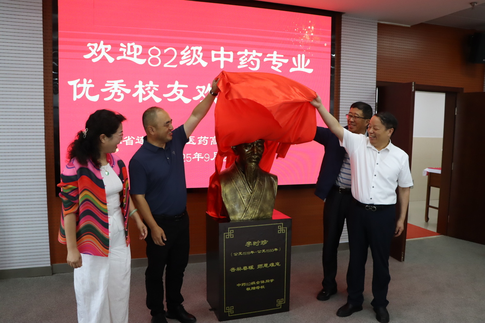 接下来,陆兔林教授、董乙文代表中药1982级校友为校友捐赠李时珍铜像,我校胡玉涛副校长、中医药系房德芳书记代表学校接受捐赠,大家共同为铜像揭幕并合影留念。