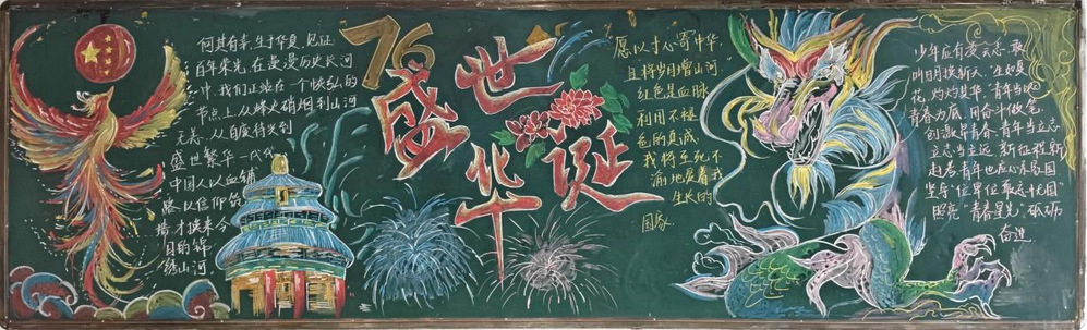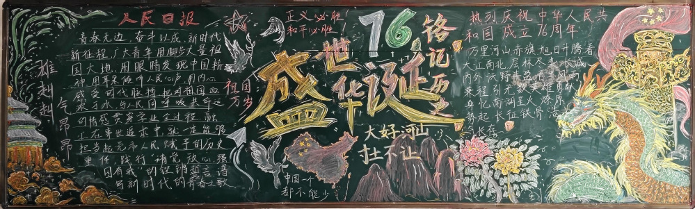 活动启动后,各班级迅速组建创作小组,展开热烈讨论与周密策划。从主题内涵挖掘到版面设计构思,从素材搜集整理到分工协作执行,同学们充分发挥创造力与凝聚力。创作现场,同学们分工明确、默契配合!有的班级以“盛世华诞”为核心,用七彩凤凰与祥云龙纹为视觉焦点,搭配天坛建筑、烟花图案,将“从烽火硝烟到盛世繁华”的历史变迁融入文字,在色彩碰撞间传递出对祖国发展的自豪;有的班级则聚焦“铭记历史 守护山河”,以金色巨龙、祖国版图和巍峨群山为元素,结合“正义必胜 和平必胜”的铿锵话语,展现青年对家国山河的赤诚担当。经过评委组从主题契合度、艺术表现力、内容丰富性等维度的综合评定,最终评选出一等奖3名、二等奖6名三等奖9名共18个获奖班级。