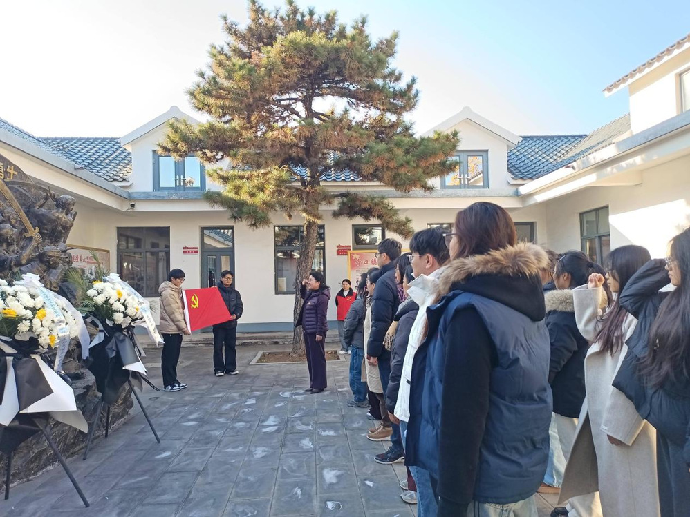 随后,师生一行前往青口十八勇士纪念馆。在庄严肃穆的纪念馆内,大家驻足凝视历史图片与文物,详细了解青口十八勇士为保卫家园、抗击侵略,挺身而出、浴血奋战的英雄事迹。在十八勇士纪念广场,全体人员整齐列队,向革命先烈敬献鲜花,肃立默哀,表达对先烈的深切缅怀与崇高敬意。面对鲜红的党旗,党支部书记带领全体党员举起右拳,重温入党誓词,铿锵有力的誓言回荡在广场上空,彰显了新时代中医药教育工作者和青年学子对党忠诚、勇担使命的坚定信念。