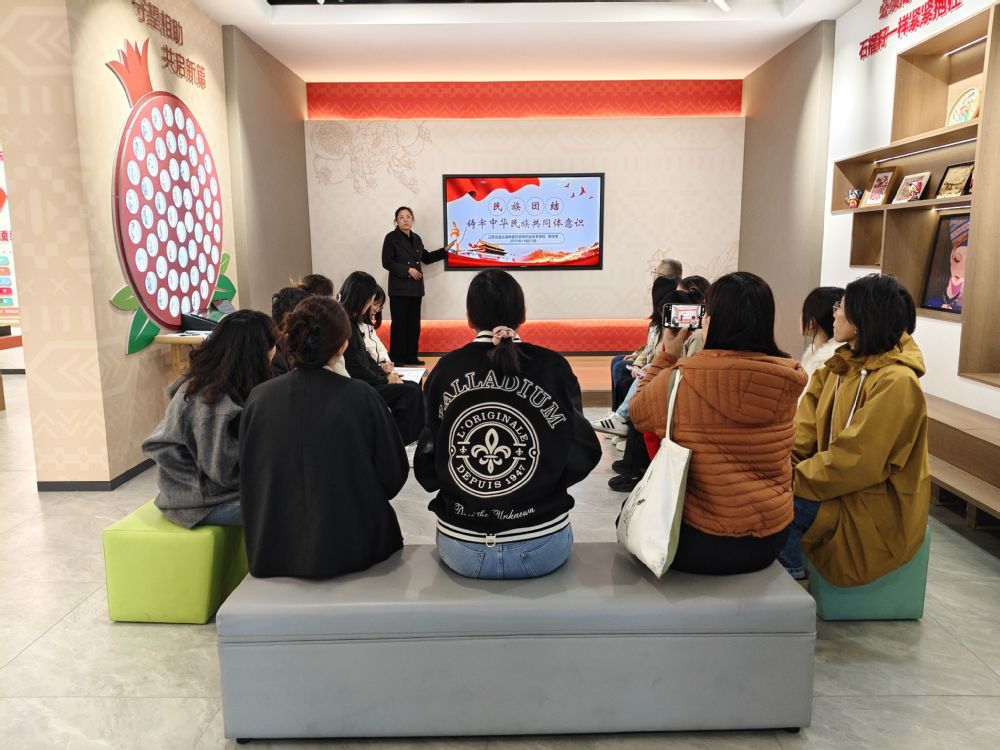活动中,在讲解员的带领下,师生们先后参观了“多元一体共创辉煌”“籽籽同心 共襄伟业”“榴连山海 共书华章”“手足相亲 共启新篇”等展区。通过参观文物、体验互动、观看投影等形式,沉浸式感受铸牢中华民族共同体意识的深刻内涵,学习感悟中华各民族在历史长河中交往交流交融的生动历程,本地各民族群众守望相助、共筑家园的鲜活实践和中华优秀传统文化作为民族团结精神纽带的深厚力量。